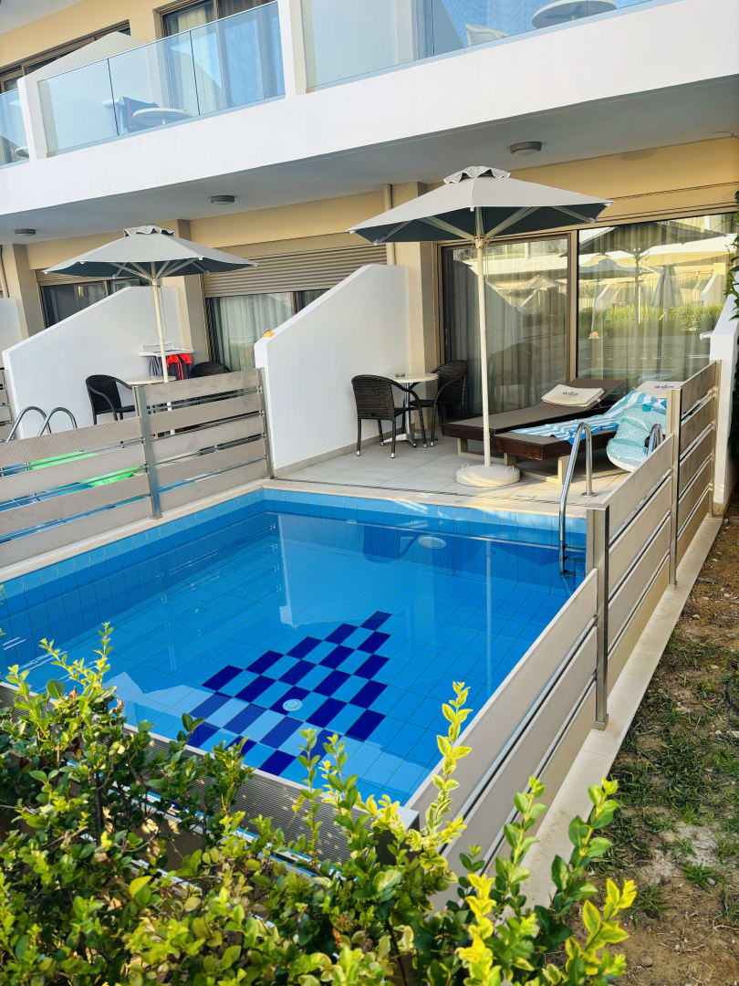 Privatpool mit eigenen Sonnenliegen, Tisch und Schirm.