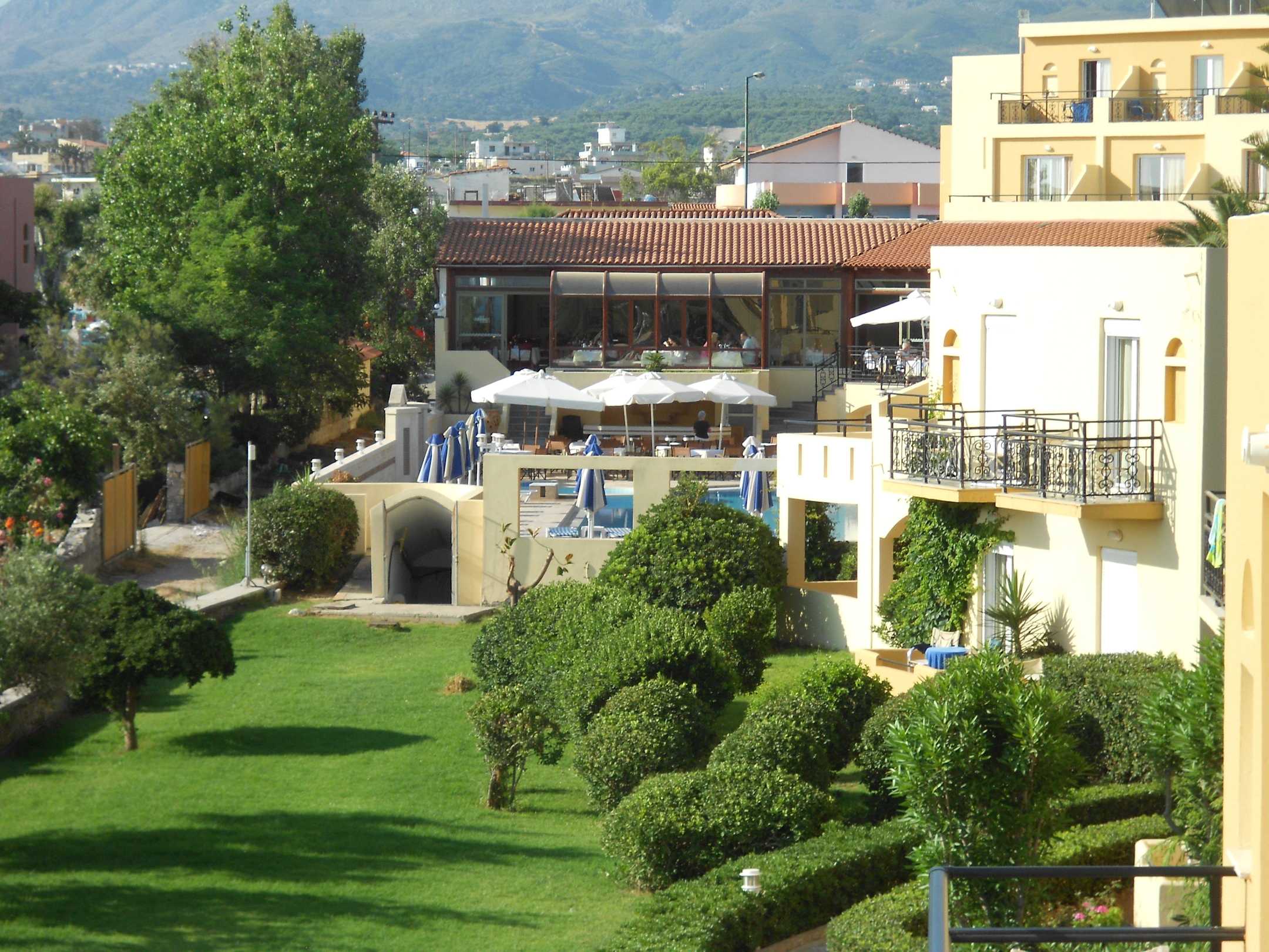Blick vom Zimmer in Richtung Pool und Restaurant