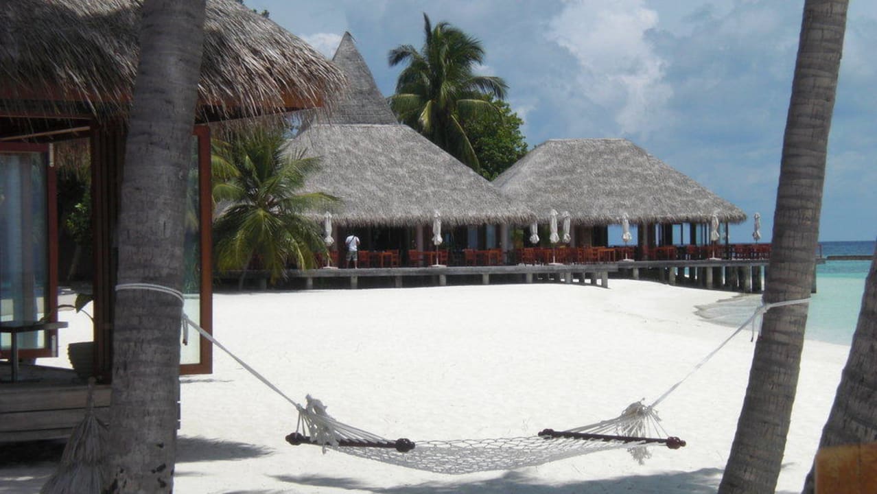 Strand und Restaurant im Hintergrund