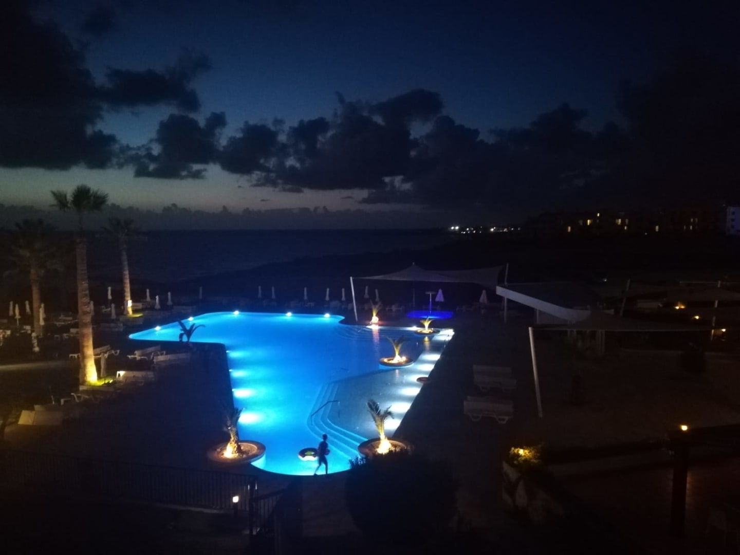 Pool mit Außenanlage und Meerblick.