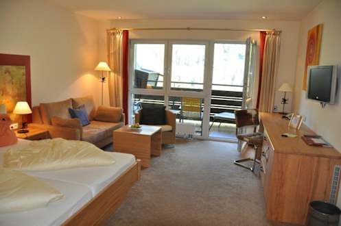 Bett, Sitzecke und Balkon des Sperior Zimmers.