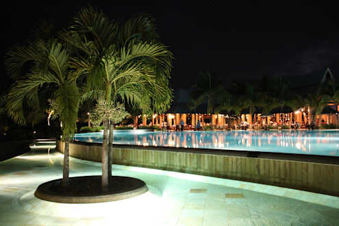 Pool bei Nacht mit Blick auf Hauptrestaurant