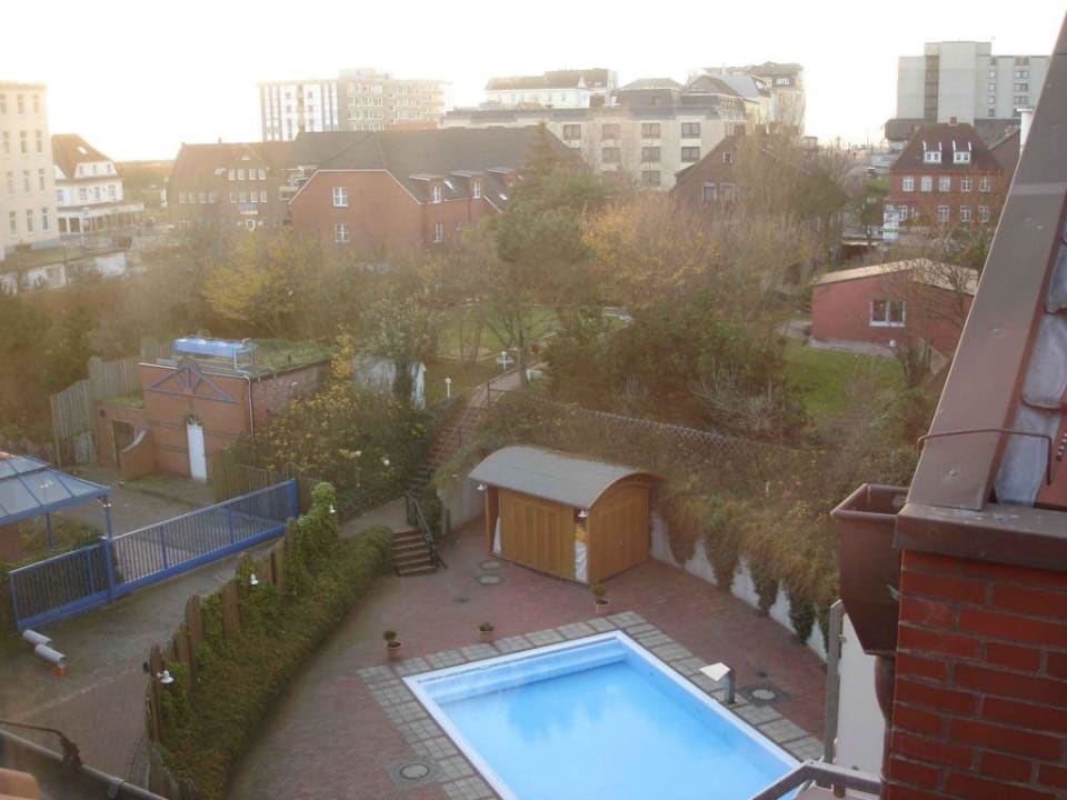 Blick auf den Pool des HotelsHinterseite des Hotels, Blick auf den Poolbereich und umgrenzende Häuser. Vor hier aus kann man das Meer sehen.