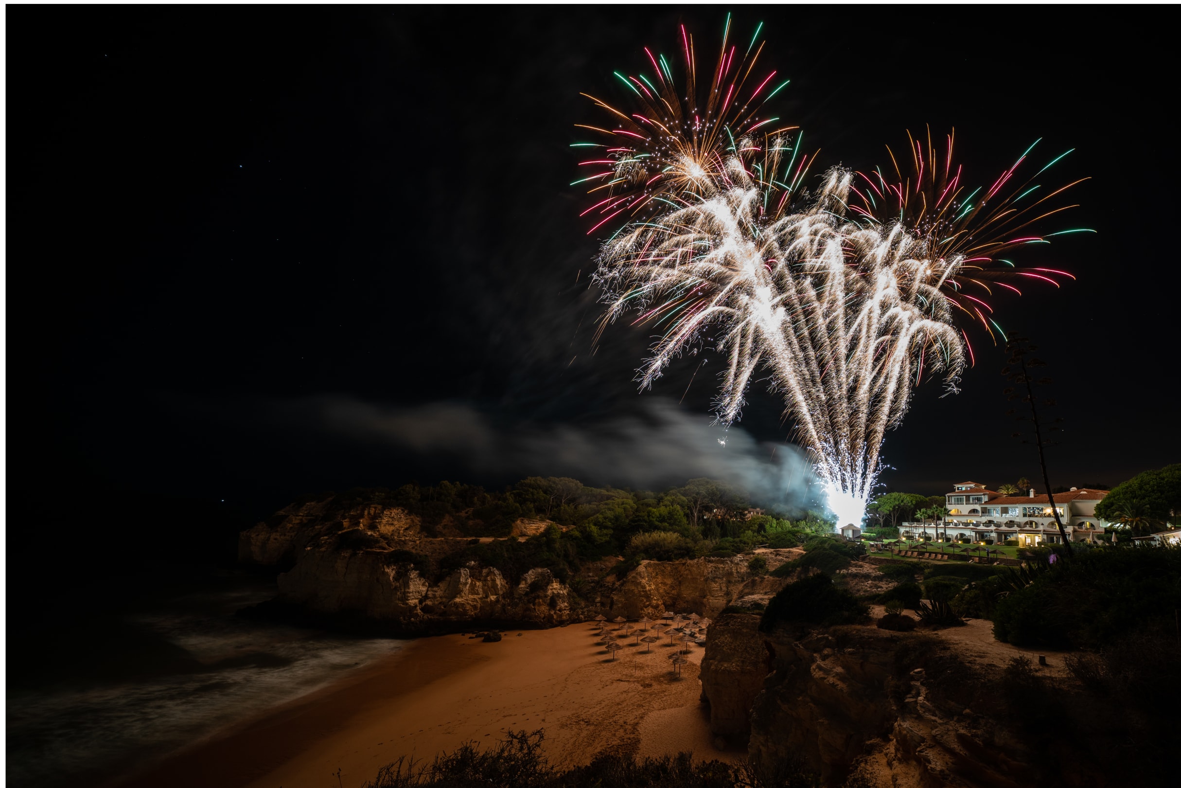 Feuerwerk über Hotel und Strand