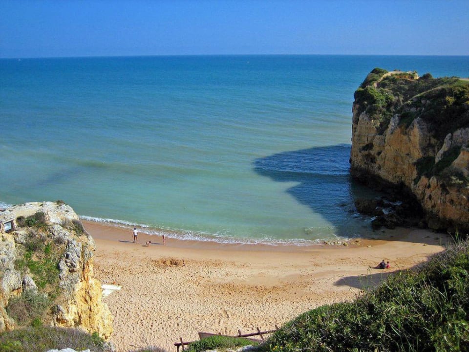 Hier der direkte Ausblick auf den hoteleigenen Strand, klein aber fein, Zugang nur über steile Treppen möglich. Das Bild wurde von den Liegewiesen des Hotels aus gemacht.