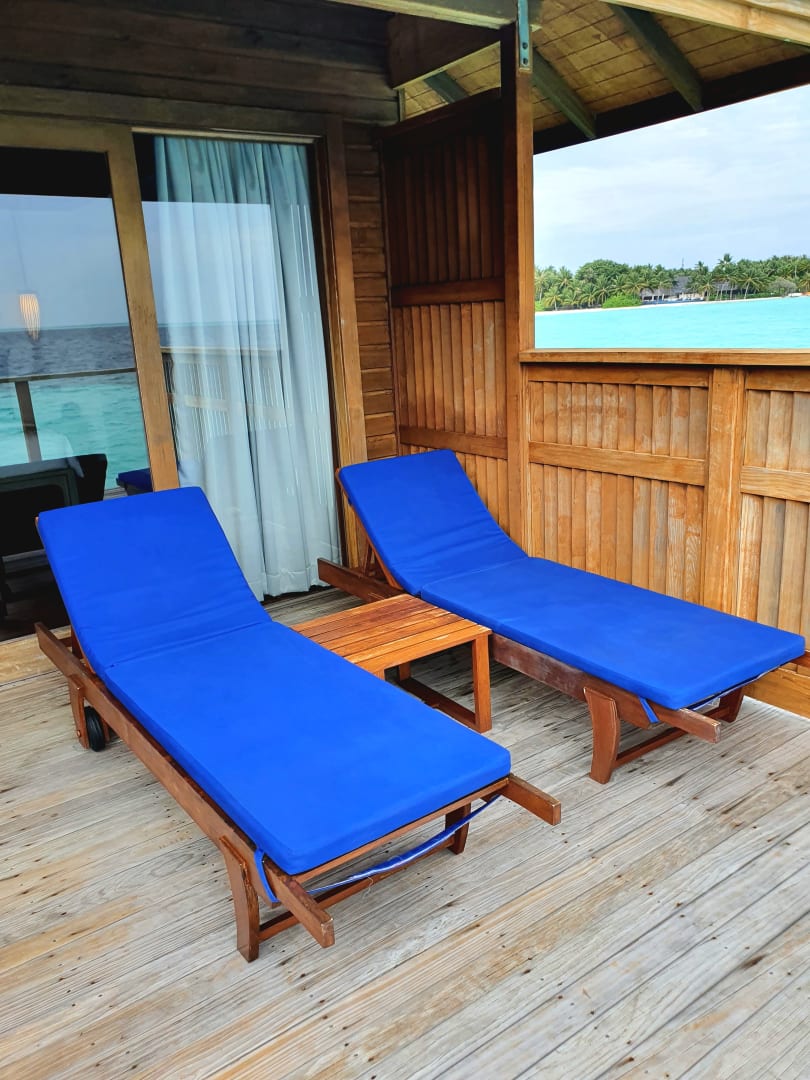 Sonnenliegen auf der Terrasse vom Wasserbungalow
