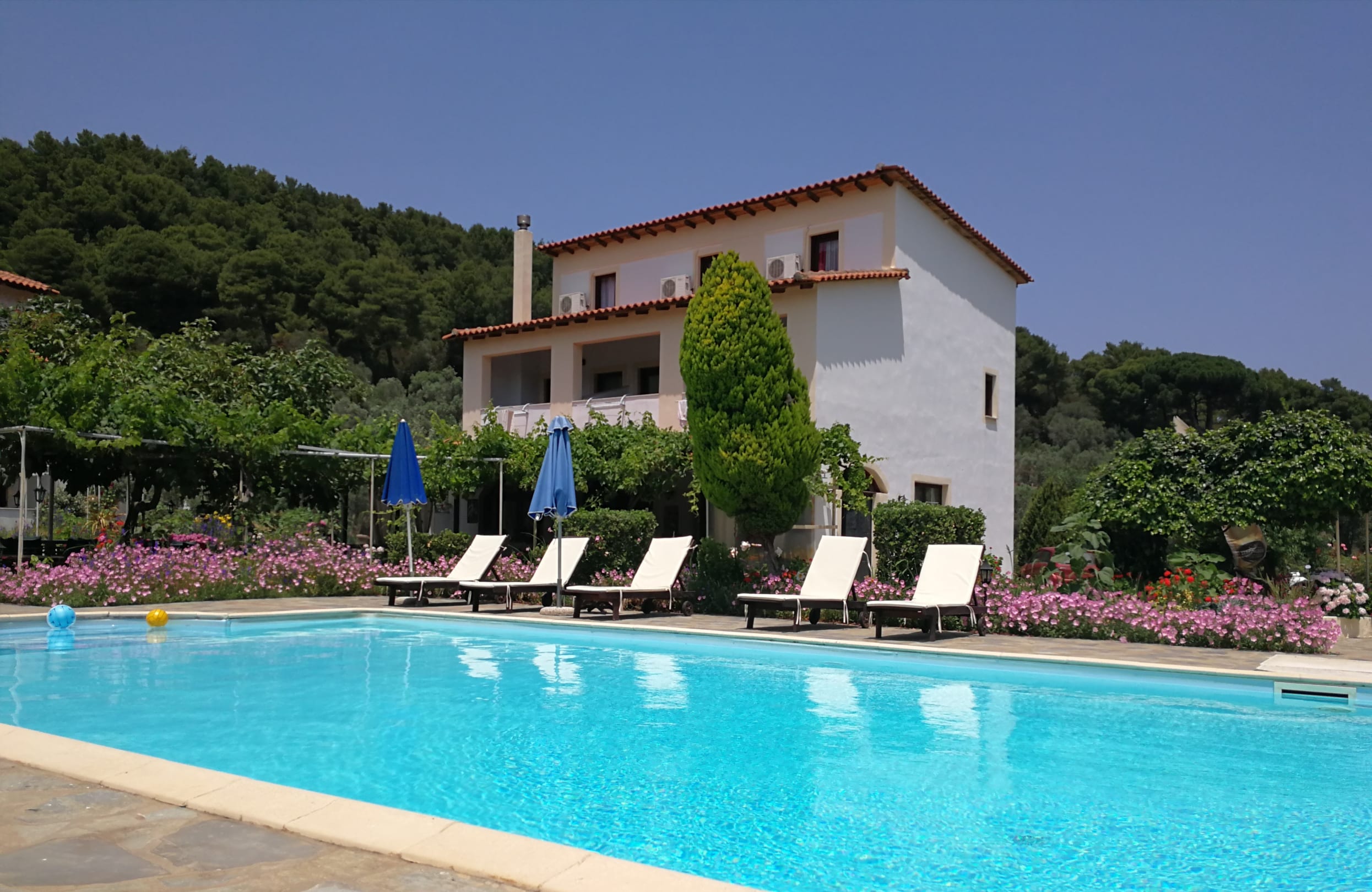 Das Hauptgebäude und davon der Swimmingpool, oben im Hauptgebäude sind Zimmer, links und außerhalb des Bildes sind zwei Gebäude mit Zimmern.