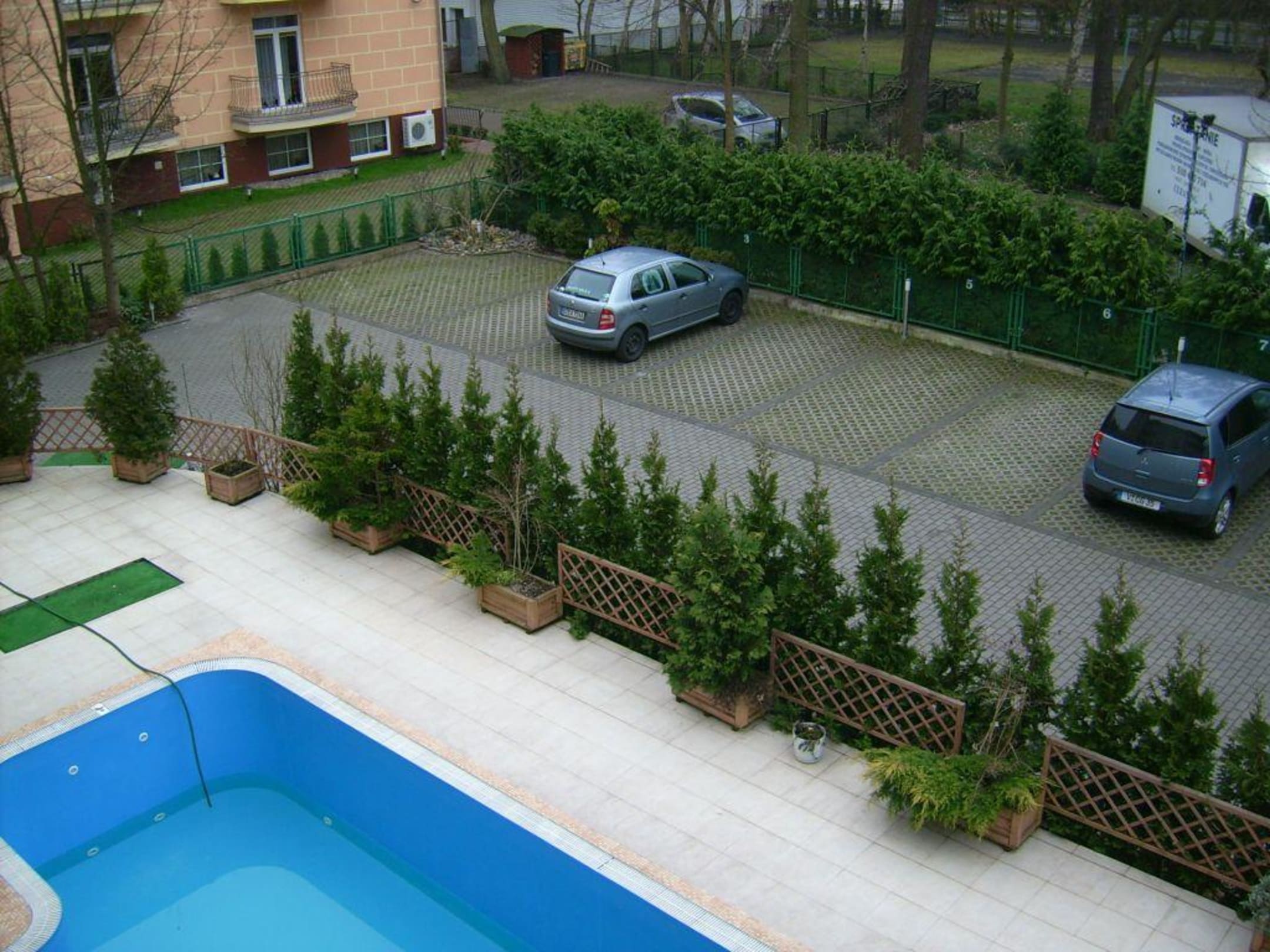Pool und Parkplatzsehr gepflegter Außenbereich mit Pool und Parkplatz ( Blick vom Balkon in der 2. Etage)