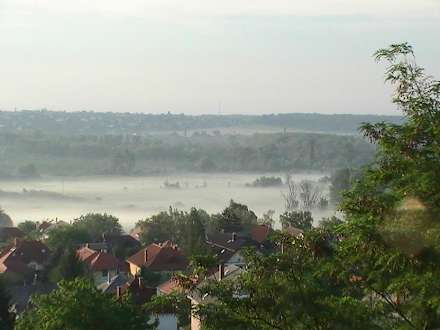 Blick vom Balkon ausam frühen Morgen über Heviz. Der Dunst des Thermalsees liegt in der Morgenkühle im Tal, er löst sich in der Sonne schnell auf.