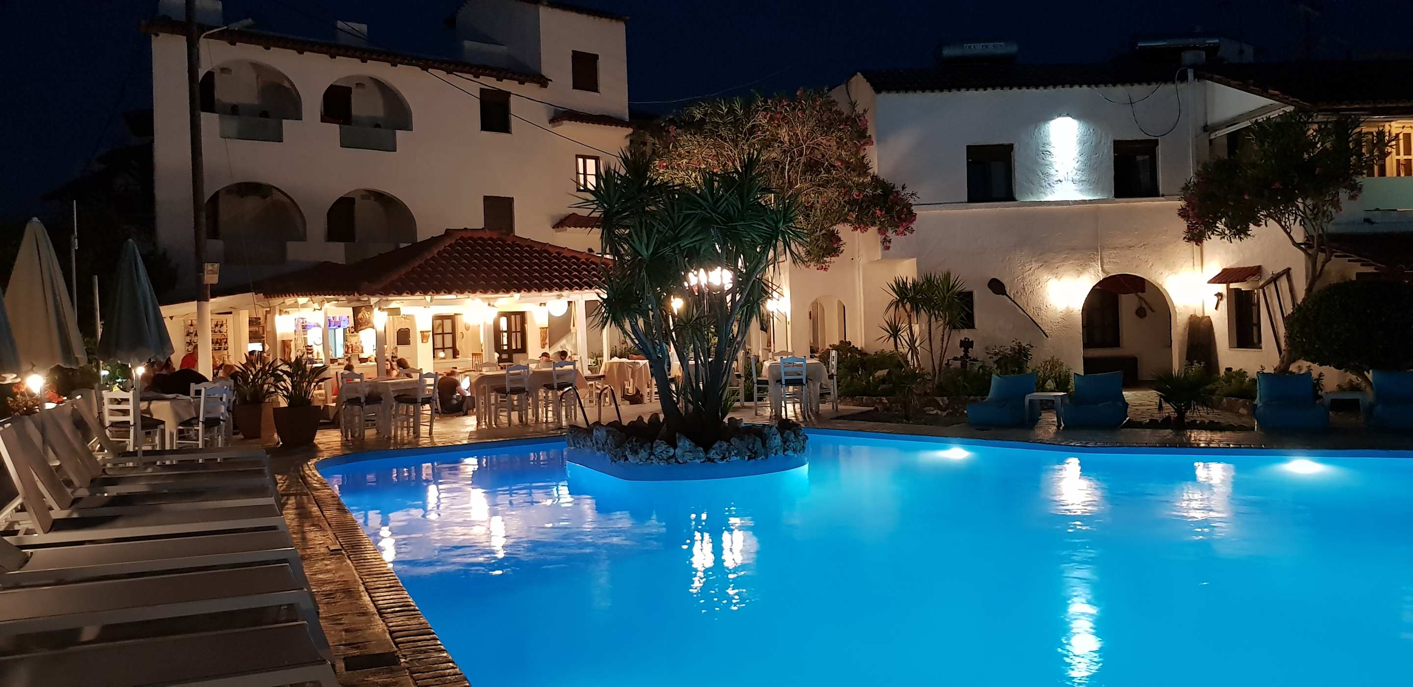 Ebenfalls der Blick über den Pool zur Taverne und der Bar