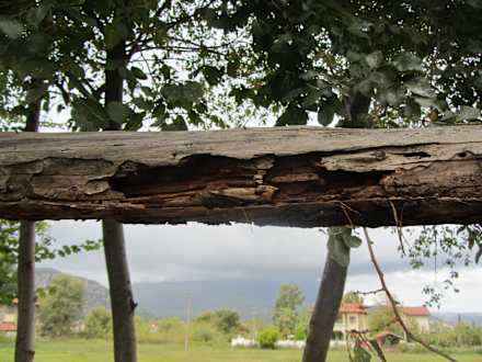 Gefährlicher Querbalken bei der HängematteUpps, das war wirklich gefährlich und wir verboten unseren Kindern die tolle und typische Hängematte zu benutzen. Ihr seht den Verbindungsbalken, der eigentlich keiner mehr ist, total zerfressen und weich wie Gummi...der wäre auf den Kopf geknallt !
