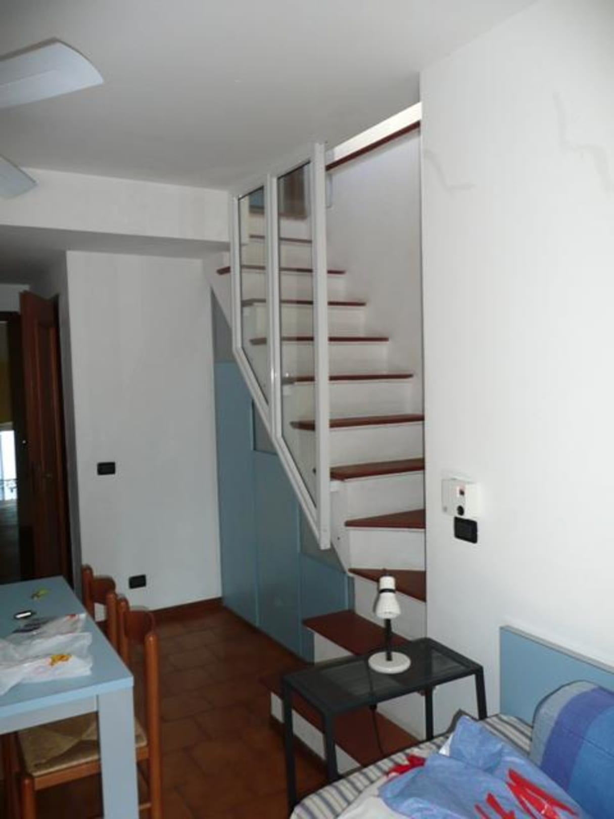 Wohnraum mit Treppenaufgang zum Balkon