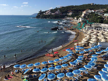Zu diesem Strand geht man vom Hotel etwa 10 Minuten. Im Wasser sind sehr viele große und kleine Steine.