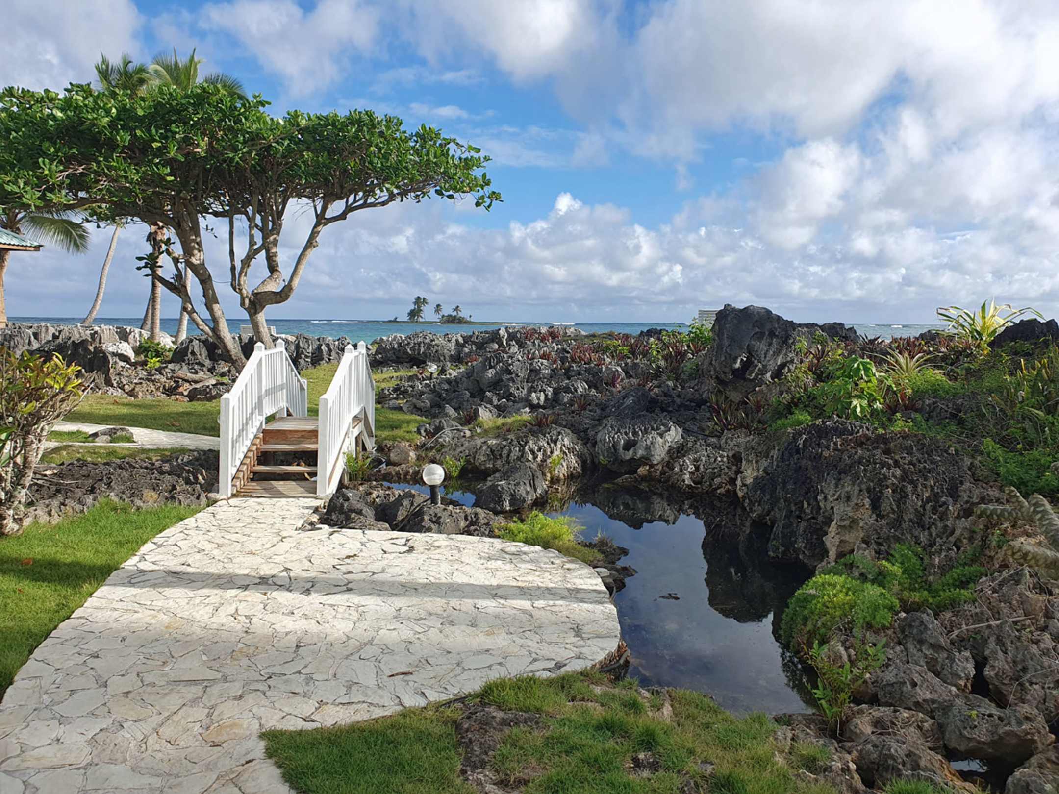 Schön gestalteter Garten mit ursprünglichen Steinen, Gewächsen und Wasserlöchern