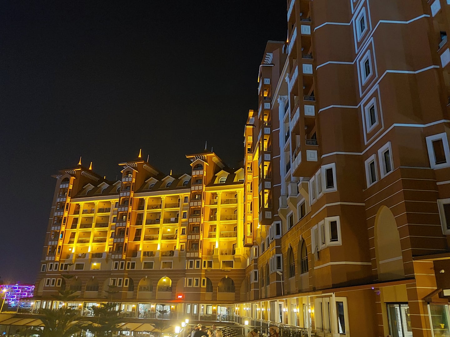 Außenansicht des Hotels am Abend.