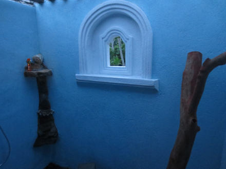 Außenduschelinks Fußdusche, mini Rundbogenfenster nach draußen, rechts Handtuchhalter aus Baumstamm, oben offene Kanthölzer