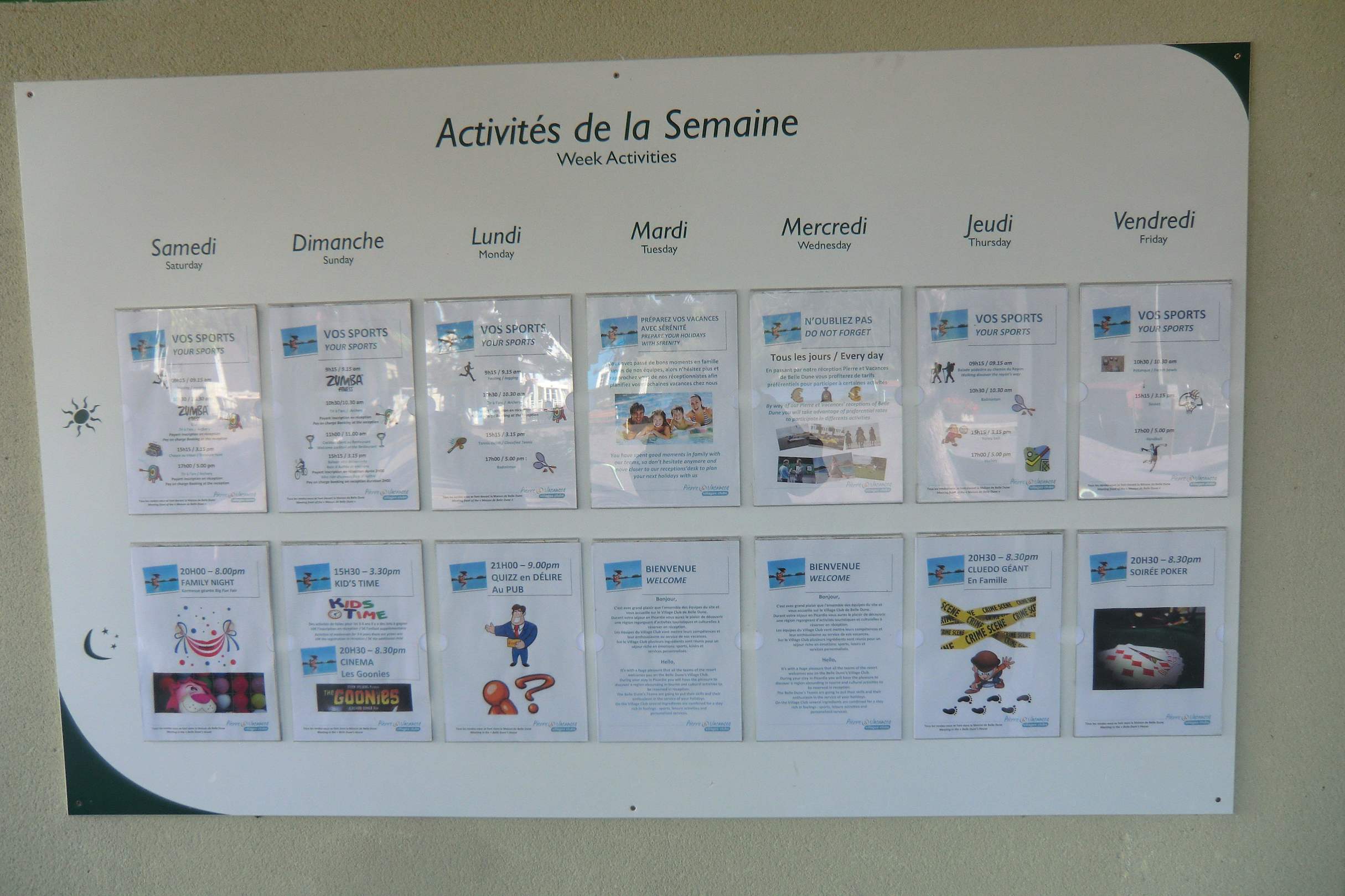 Tafel für die Aktivitäten im Parkzentrum