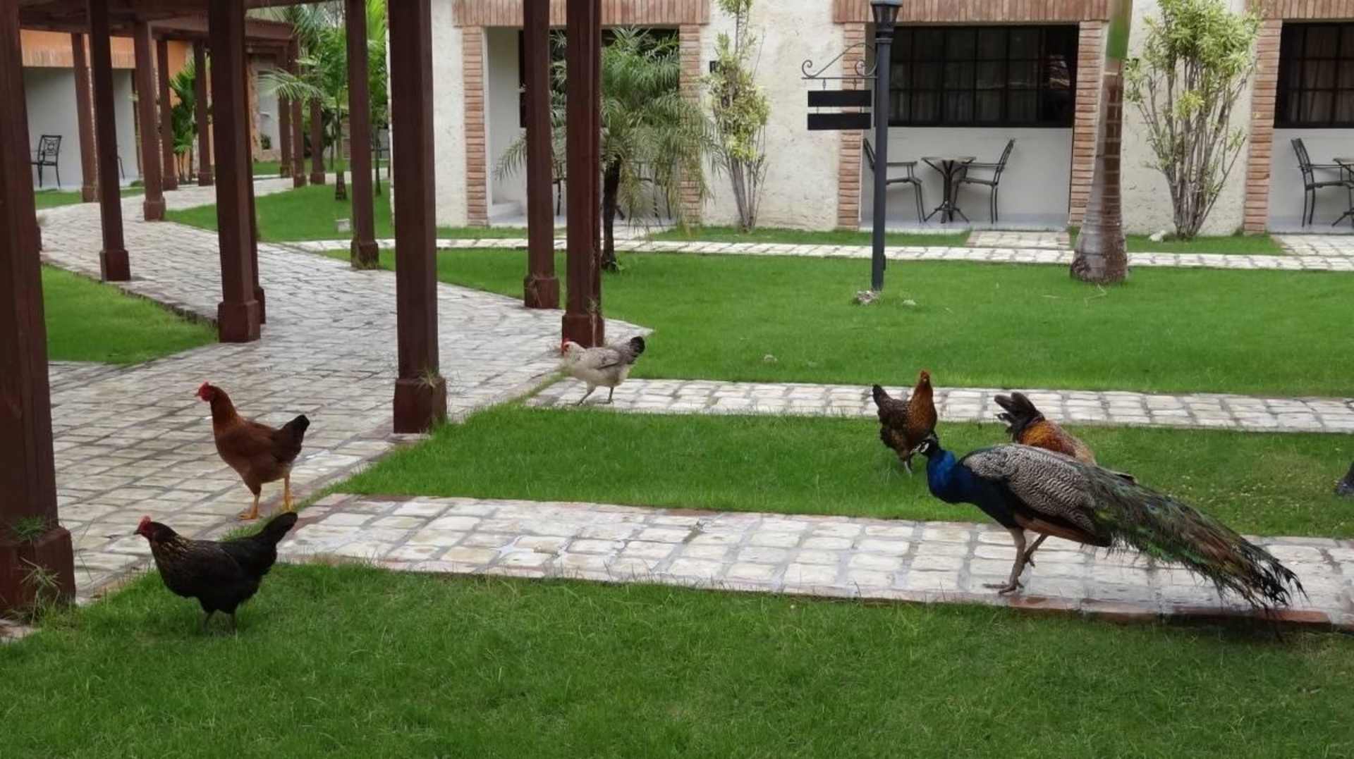 Pfaue, Hühner zwischen den Bungalows