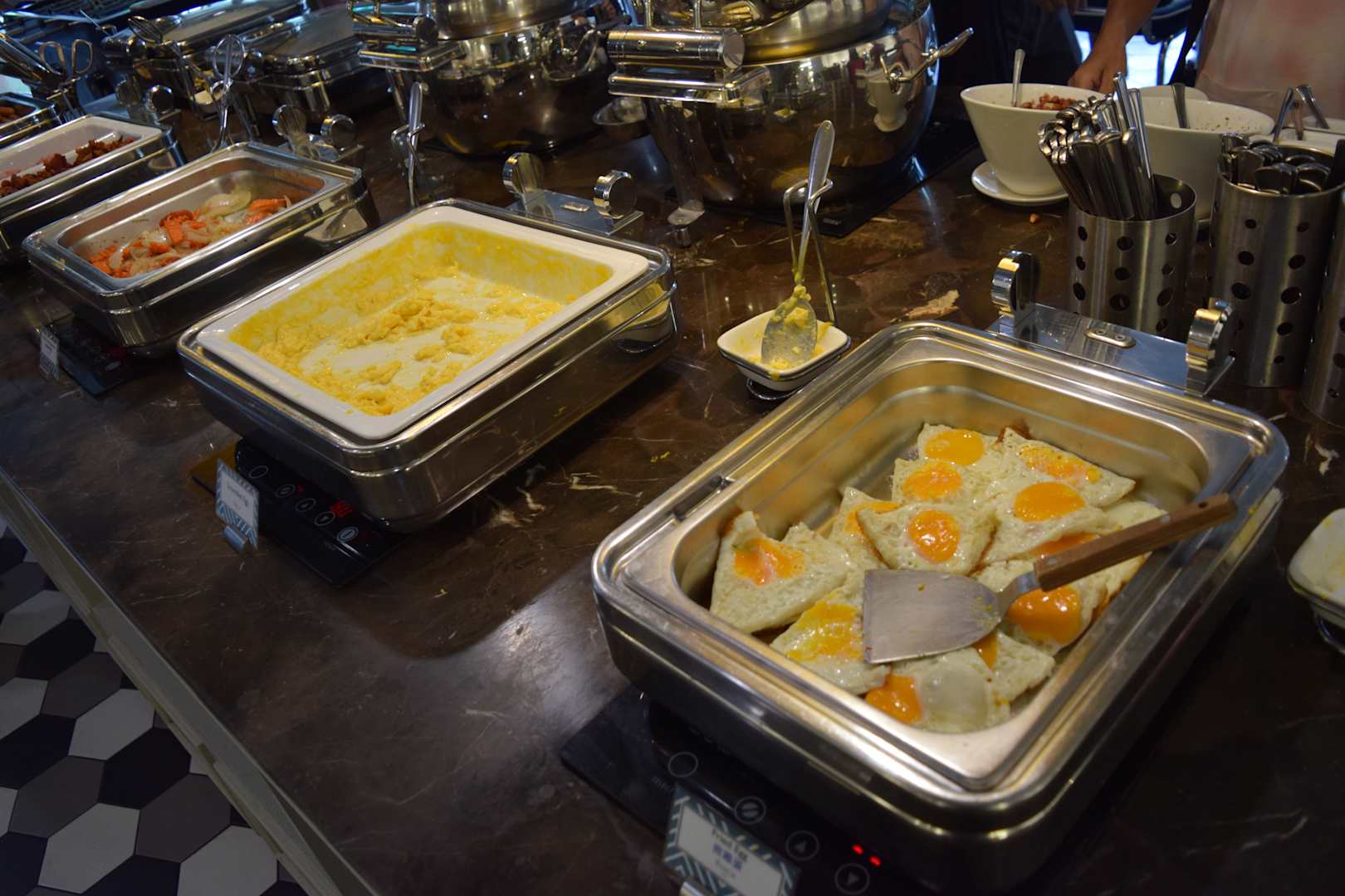 Buffet im "normalen" Restaurant des Vince-Hotels. Die Warmhalte-Behälter bereits kaputt. Das Restaurant im Vince Elite-Tower (den wir eigentlich für teures Geld gebucht hatten) war selbst 2 Monate nach der Eröffnung nicht fertig.