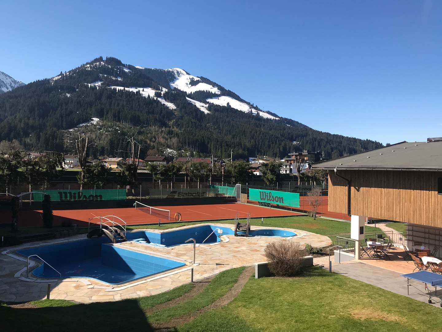 Blick von der Hotelterrasse zum Aussenpool mit Tennisplatz 1