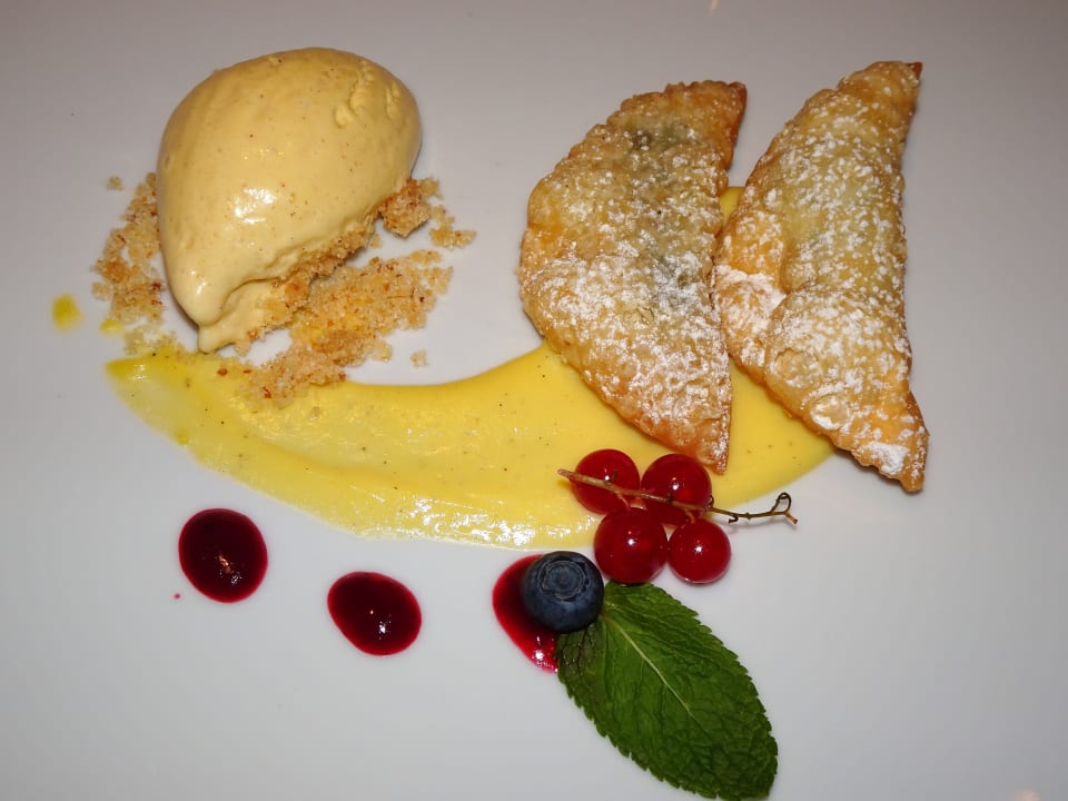 Abendessen im Hotel Dosses: Mohnkrapfen mit Zimteis und Vanillesauce