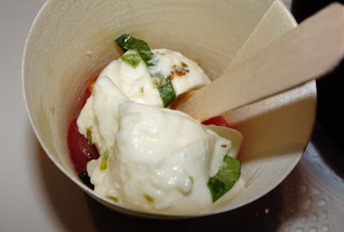 Abendessen im Hotel Dosses: Büffelmozzarella mit Tomaten und Basilikum als Teil der "Flying starters"