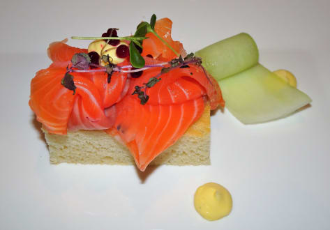 Abendessen im Hotel Dosses: Hausgebeizter Lachs mit Gurkenkaviar und Kardamon-Mojo