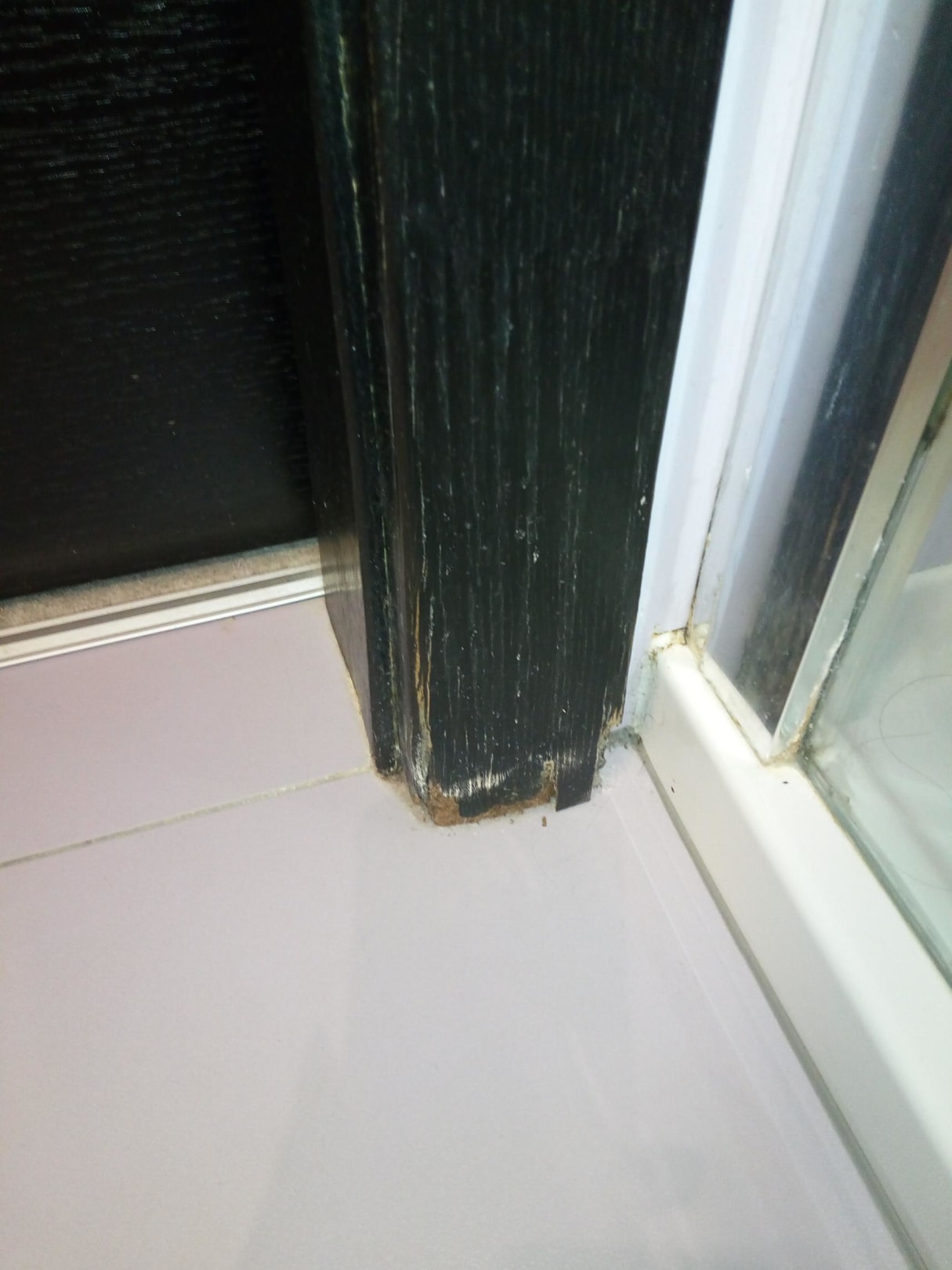 ZimmerAufgeweichter Türstock, wahrscheinlich durch auslaufendes Wasser aus dem Duschbereich