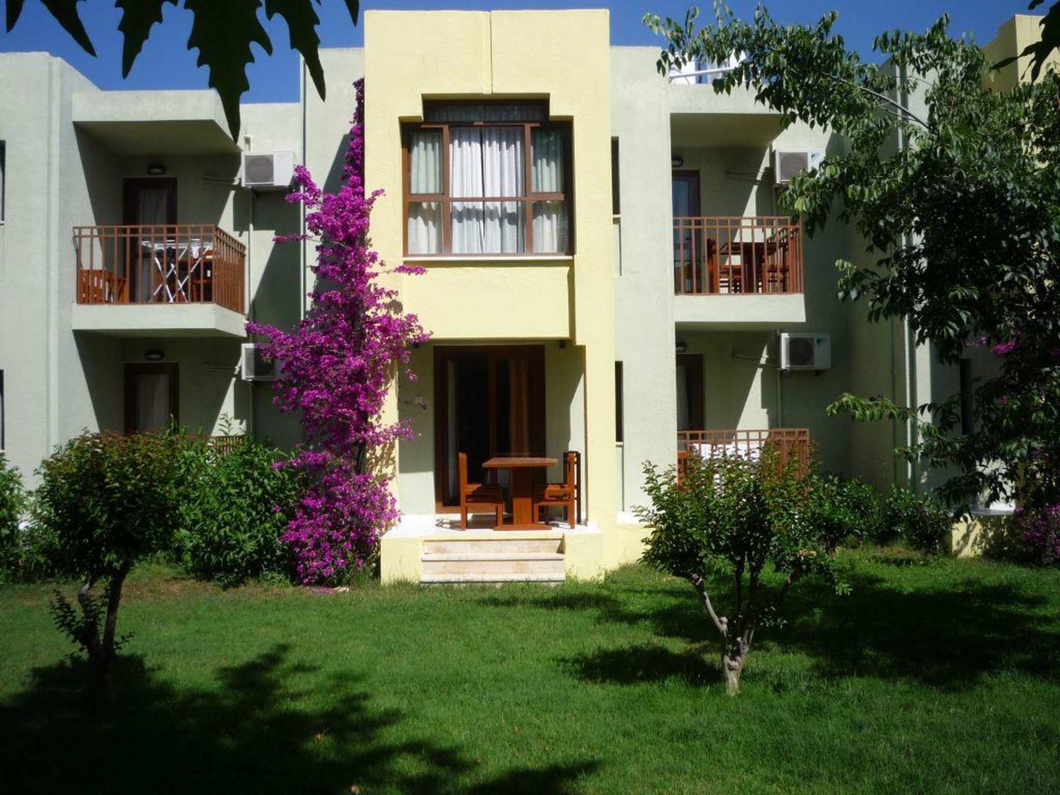 Man beachte das im oberen Stockwerk nur ein sehr kleiner Balkon vorhanden ist. Unten gibt es eine große Terasse und einen Balkon