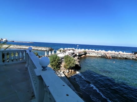 Blick auf Sonnenterrasse mit Zugang zum Meer