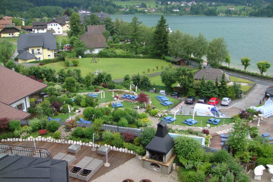 Blick vom Zimmer auf die Anlage und den See
