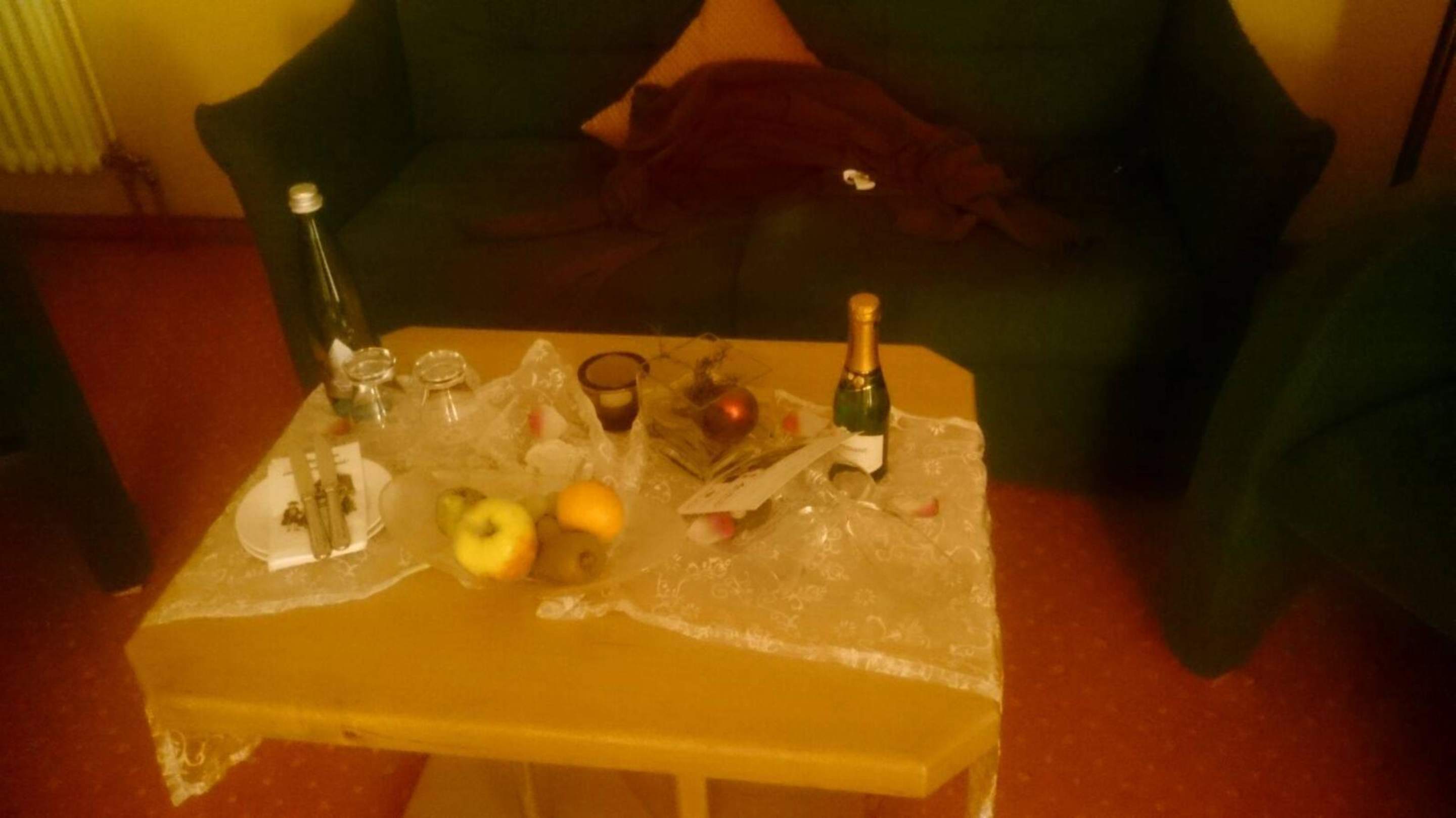 Frisches Obst, Wasser und Piccolo auf dem Zimmer