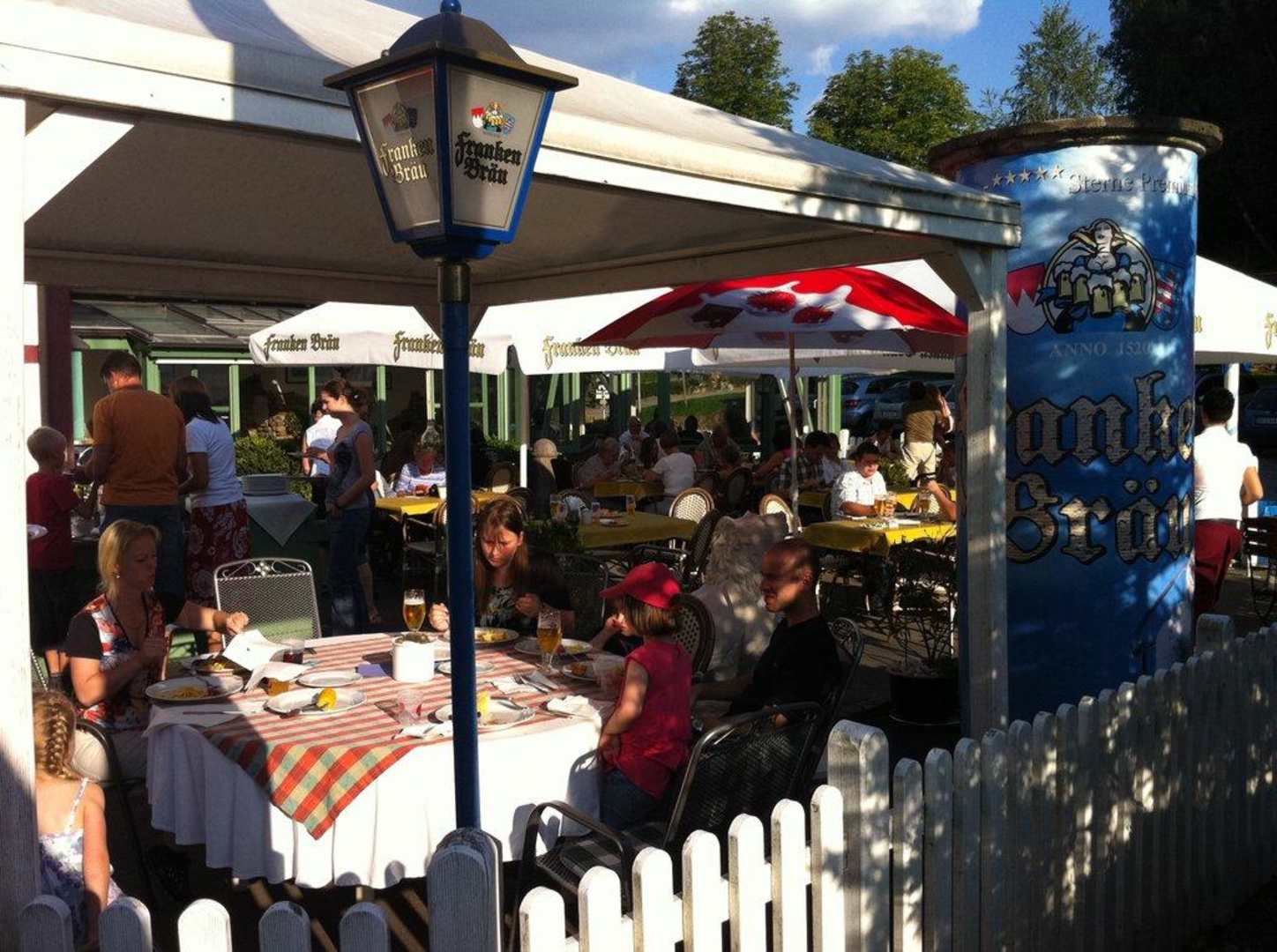 Biergarten mit Wintergarten dahinter Waldhotel Bächlein