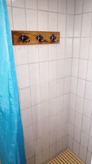 Dusche im Wellnessbereich. Mit Holzkleiderleiste in Dusche, sehr schlau.