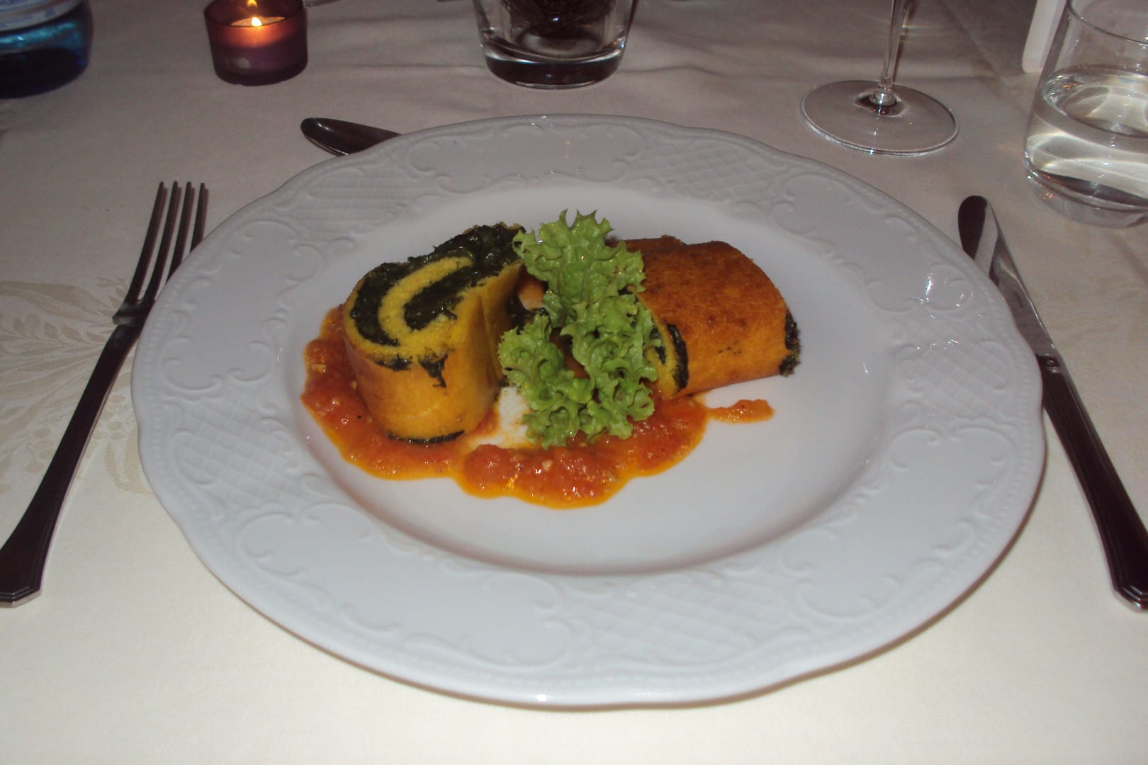 Vegetarisches Hauptgericht Kartoffel-Spinatroulade.