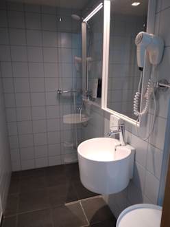 Minibad mit sehr kleinem Waschbecken und zu kurzer Duschwand