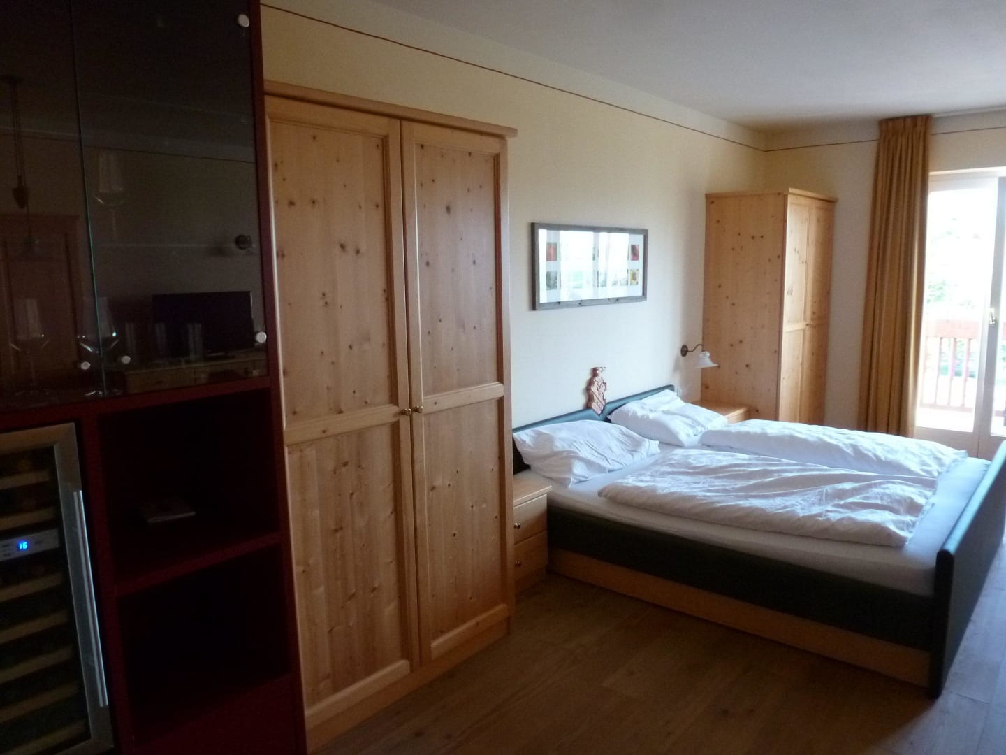Bett und Weinkühlschrank