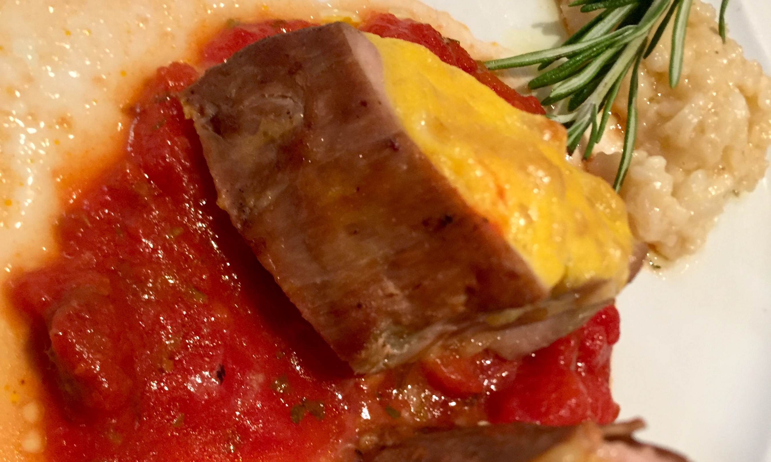Abendmenü: "Mit Parmesan überbackenes Filet vom Schwein auf Tomatenjus mit feinem Risotto"