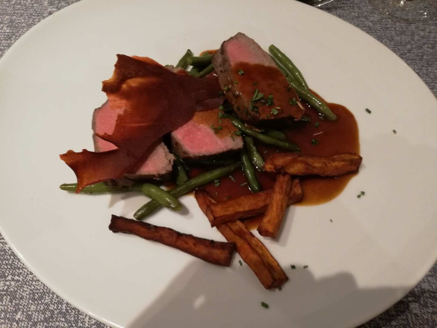 gebratene Rindermedaillons, Zwiebelsoße, Speckbohnen, Süßkartoffelpommes