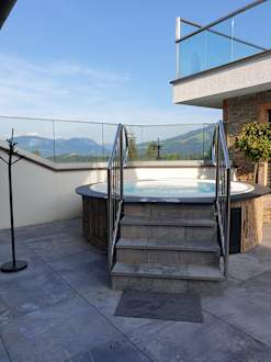 Wirlpool auf dem Dach im Freien. Weiterer Wirlpool gegenüber, überdacht. Hervorragender Wellnessbereich mit Saunen, Dampfbäder, Heubad, in- und Outdoorpool, Fitnessraum und vieles mehr...