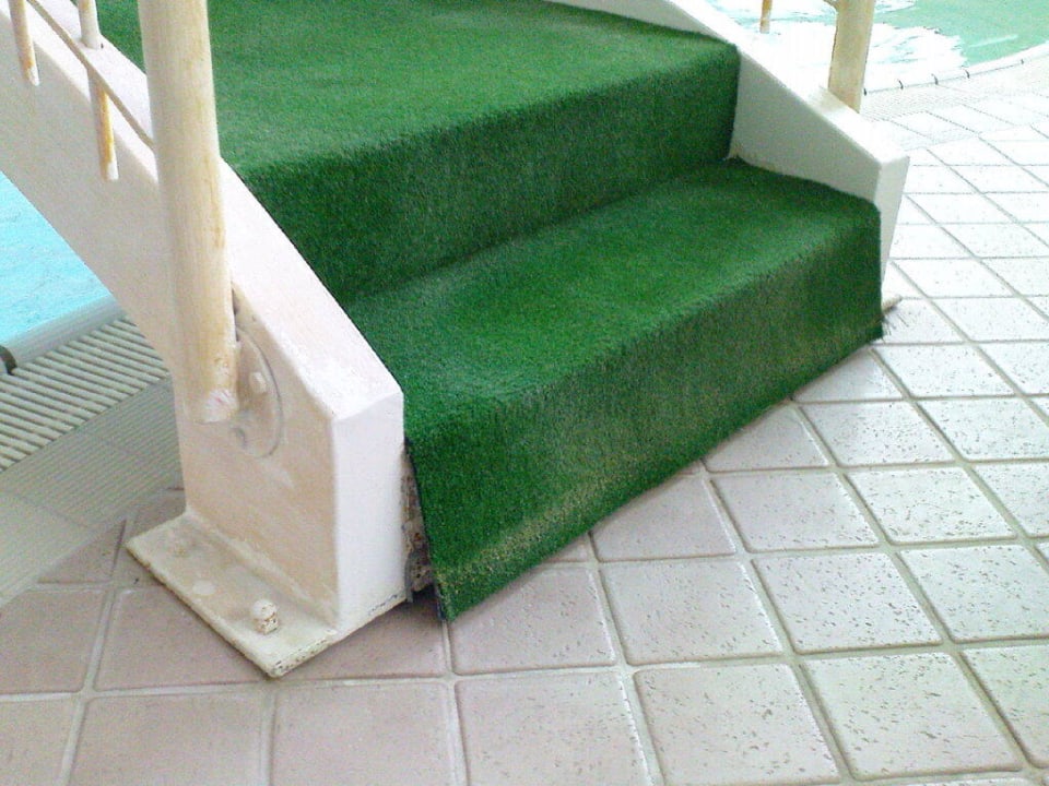 Der Teppich ist etwas verfärbt und löst sich von der Treppe.