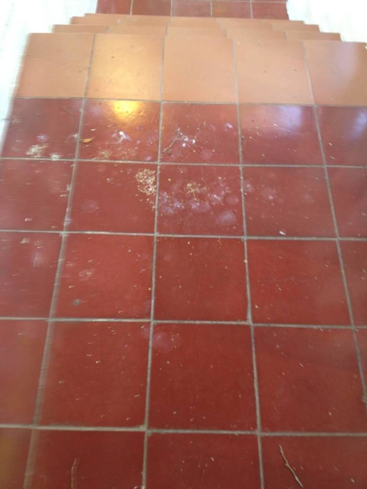 Schmutzige FliesenFliesen im Eingangsbereich und Zimmer voller Flecken (Farbe, Taubenkot)