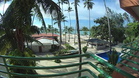 Ausblick aus meinem renovierten Zimmer zum StrandAuf diesem Ausblick ist vorne rechts der zweite kleinere Pool im erwachsenen Bereich zu sehen. hinten ist der Strandbereich für Erwachsene zu sehen.