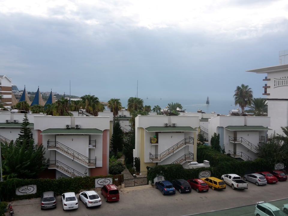 Ausblick vom Balkon auf Parkplatz und Meer