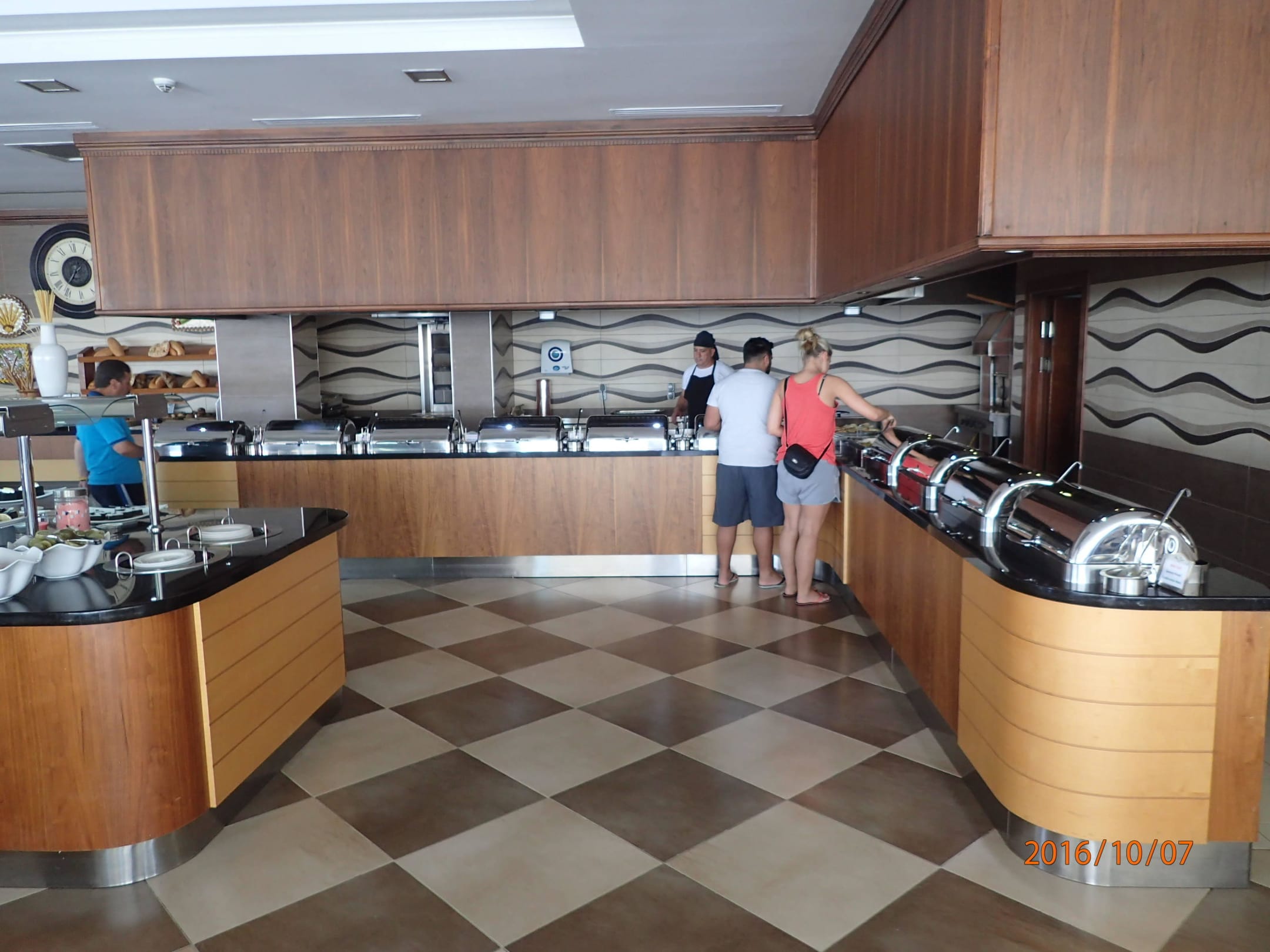 Das Mittagsbuffet 3Das warme Essen befindet sich in den Edelstahlbehältnissen. Es ist durch Hauben abgedeckt. Wenigstens hier kann man durch beschriftete Kärtchen ablesen, was sich unter den Hauben befindet.Abends ähnelt sich das Essen dem Mittagessen? Resteverwertung?