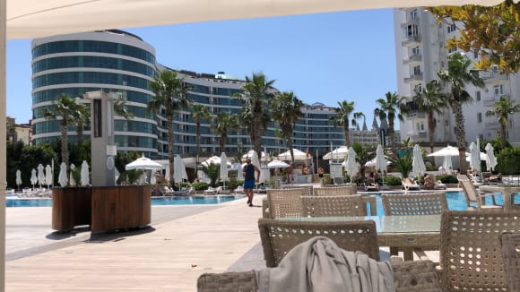 Wunderschöne Ausblick zu einem verlassenem Hotel, der nie in Betrieb genommen wurde. Die Tische werdeb übrigens nicht feucht gewischt. Der Dreck wird überdeckt mit Tischdecken, allesdrings klebt es dennoch.