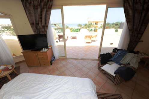 Unser 45 qm großes Zimmer mit 40 Zoll Sony Flachbildschirm, mit schönem neu bezogenen Sessel und mit Blick durch die große Schiebetür über den Balkon, Beach und gesa<mte Bucht