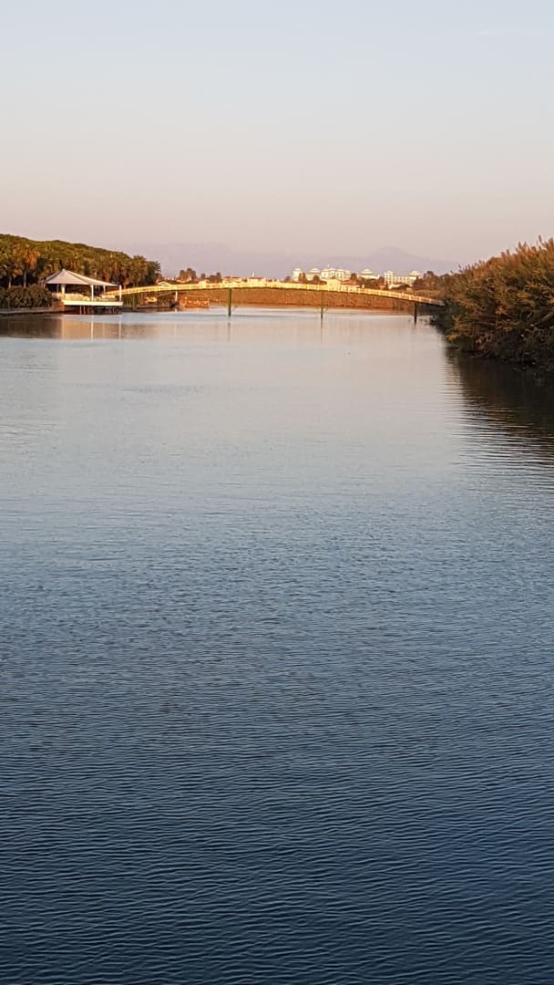 auf der Brücke über den Fluss unterwegs zum Strand