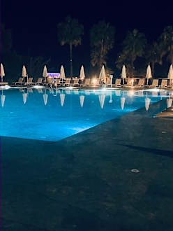 Grosser Pool am Abend mit Ausblick zum Hotel auf der anderen Küstenbiegung Seite.