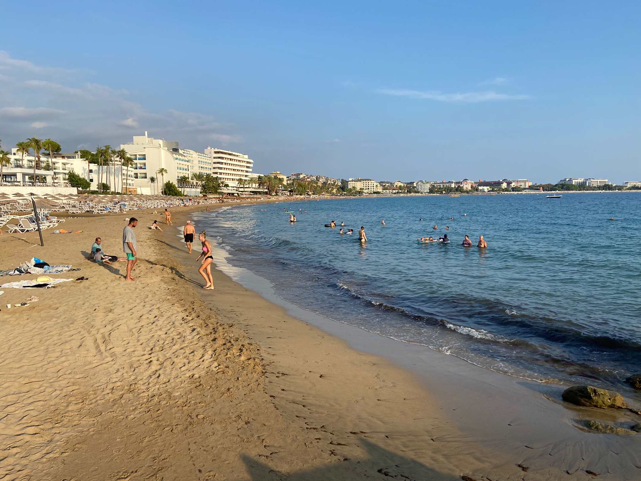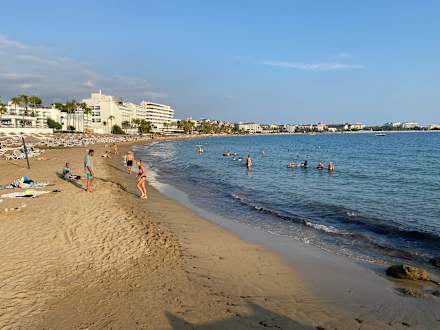 Strand mit flachem Sandstrand, wenig bis gar keine Steine, Volleyballfeld vorhanden sowie Boccia.